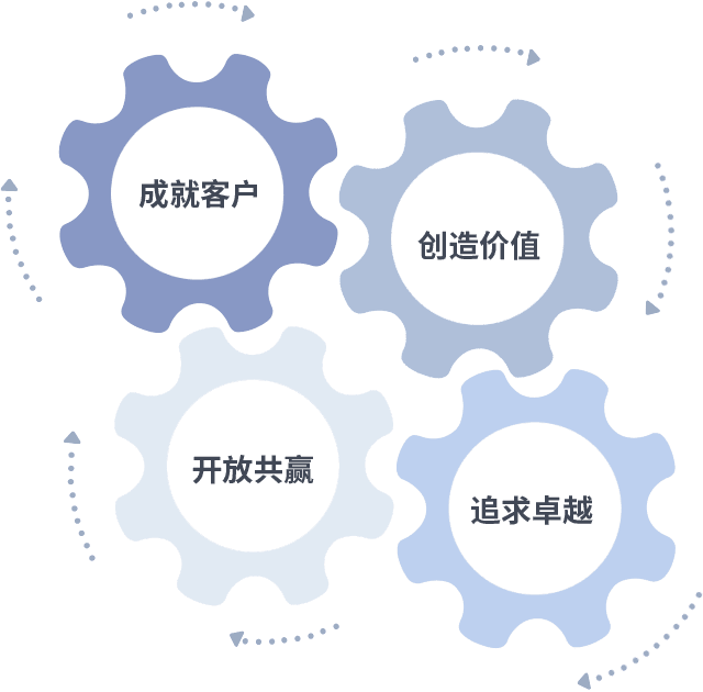 成就客户是一切决策的出发点,,,,创造价值是衡量所有工作的标准,,追求卓越是我们做事做人的态度,,开放共赢是我们的格局也是最终的结果。。。价值观的齿轮环环相扣,,,,推动着组织里的每个人不断向前。。。。